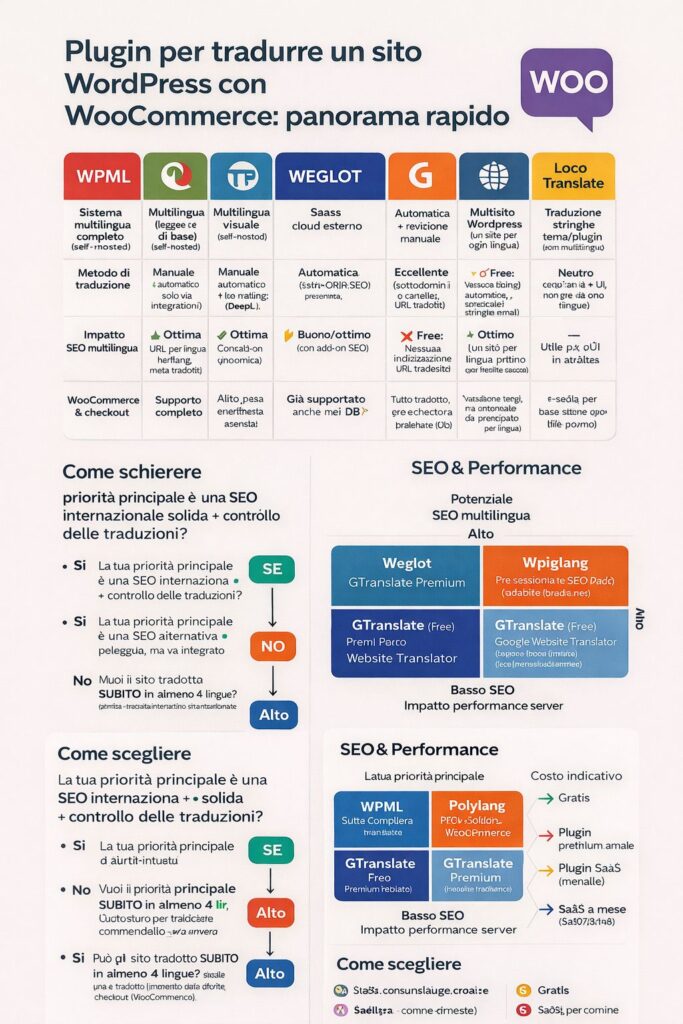 Dalla comparazione sopra emergono diverse soluzioni adatte a scenari differenti. Per scegliere il plugin più adatto, bisogna considerare budget, risorse disponibili per la traduzione, importanza della SEO, complessità del sito e flusso di aggiornamento dei contenuti. Di seguito un riepilogo comparativo in base ad alcuni criteri chiave, con particolare attenzione al caso di un sito e-commerce che aggiorna spesso i contenuti e punta alla SEO in 4 lingue: